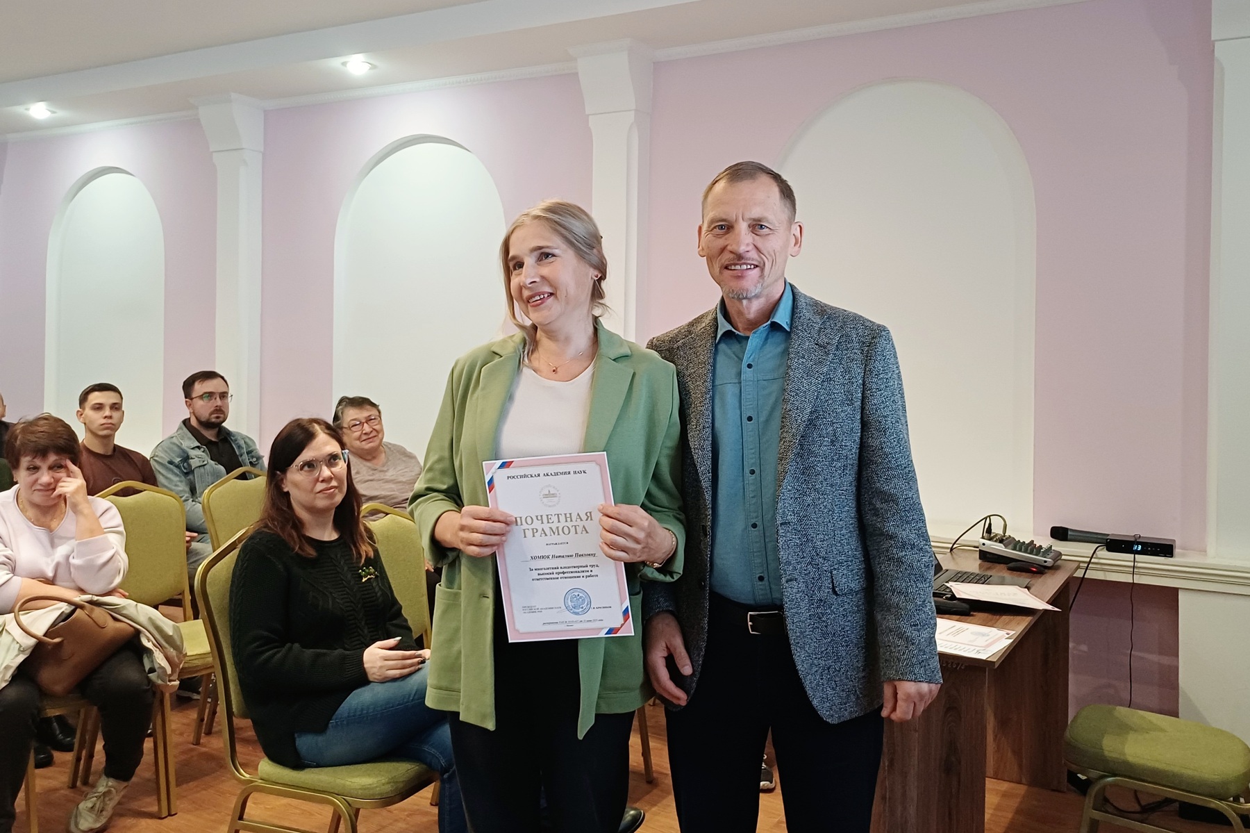 За многолетний плодотворный труд, высокий профессионализм и ответственное отношение к работе почетными грамотами РАН были отмечены 10 сотрудников Томского научного центра. В их числе: старший научный сотрудник Ольга Шкода, бухгалтер Марина Гоголинская, инструктор по спорту Наталия Хомюк, инженер Флюра Зенина, горничные Наталья Баженова и Наталия Комлева, дворник Вадим Бушуев, уборщики служебных помещений Галина Сафонова и Татьяна Селихова, вахтер Татьяна Ларина.