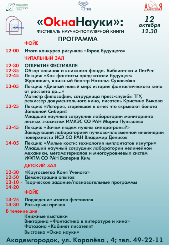Третий Городской фестиваль научно-популярной книги «ОкнаНауки», организованный Муниципальной информационной библиотечной системой города Томска и Томским научным центром СО РАН, пройдет 12 октября в библиотеке «Академическая» по адресу ул. Королева, 4. В этом году темой фестиваля станет фантастика – на страницах книг и в стенах научных лабораторий. Начало в 12:30.