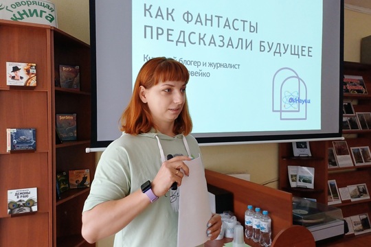 Лекция журналиста и книжного блогера Натальи Суховейко стала необычным экскурсом в историю научной фантастики и научных триумфов. В своем выступлении она рассказала о том, как в произведениях российских и зарубежных авторов были предсказаны различные достижения науки и техники. Так, например, в начале ХХ века Александр Богданов и Герберт Уэллс на страницах своих книг писали об появлении атомной энергии и создании АЭС. В романе Карела Чапека появился робот, а в известном произведении Олдоса Хаксли – прообраз ЭКО.