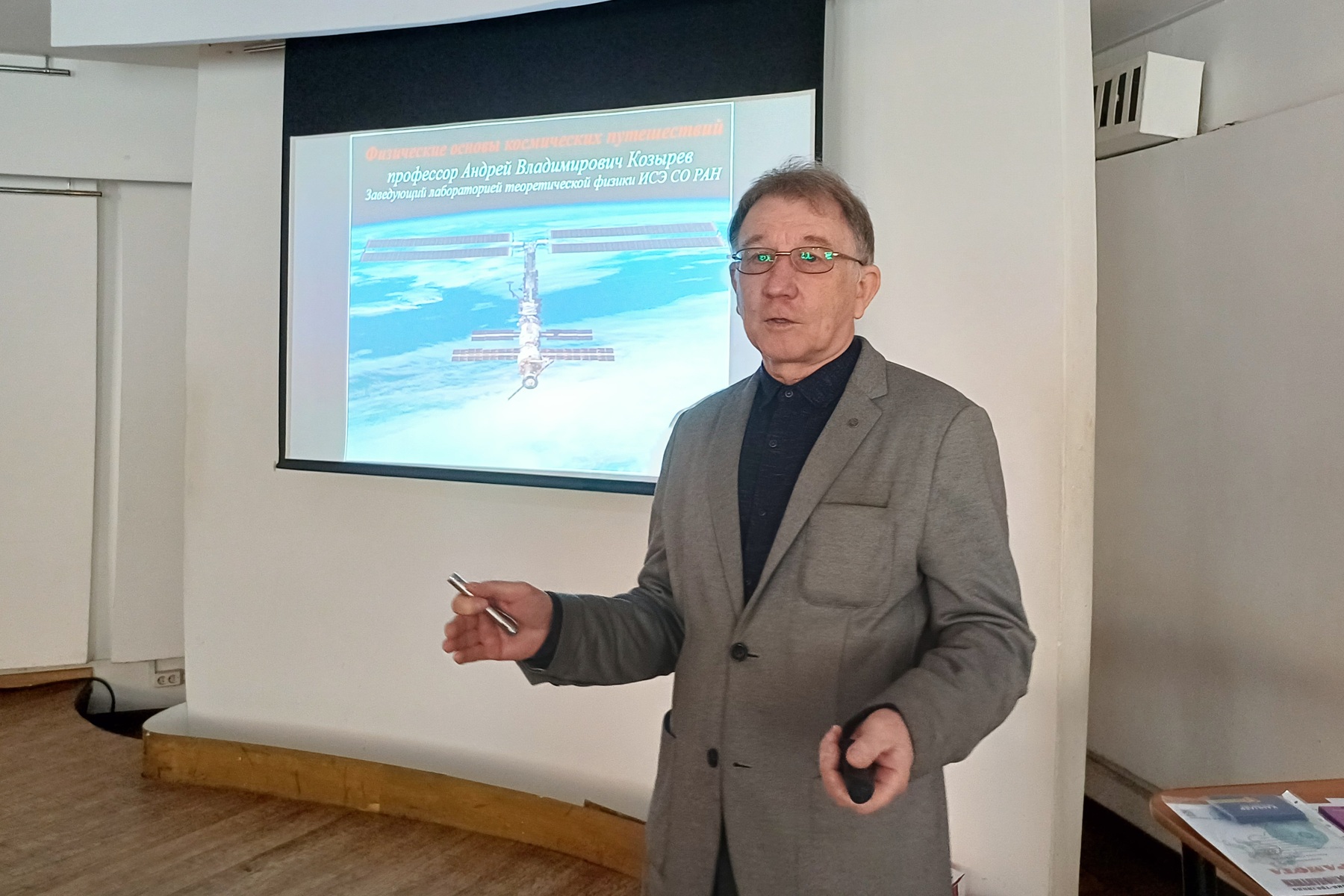 Первая лекция, прочитанная доктором физико-математических наук, зав. лабораторией теоретической физики ИСЭ СО РАН профессором Андреем Козыревым, была посвящена истории освоения космоса, тому, как человеческая и научная мысль пришла к возможности преодолевать земное притяжение. В своем выступлении он объяснил ключевой физический принцип: