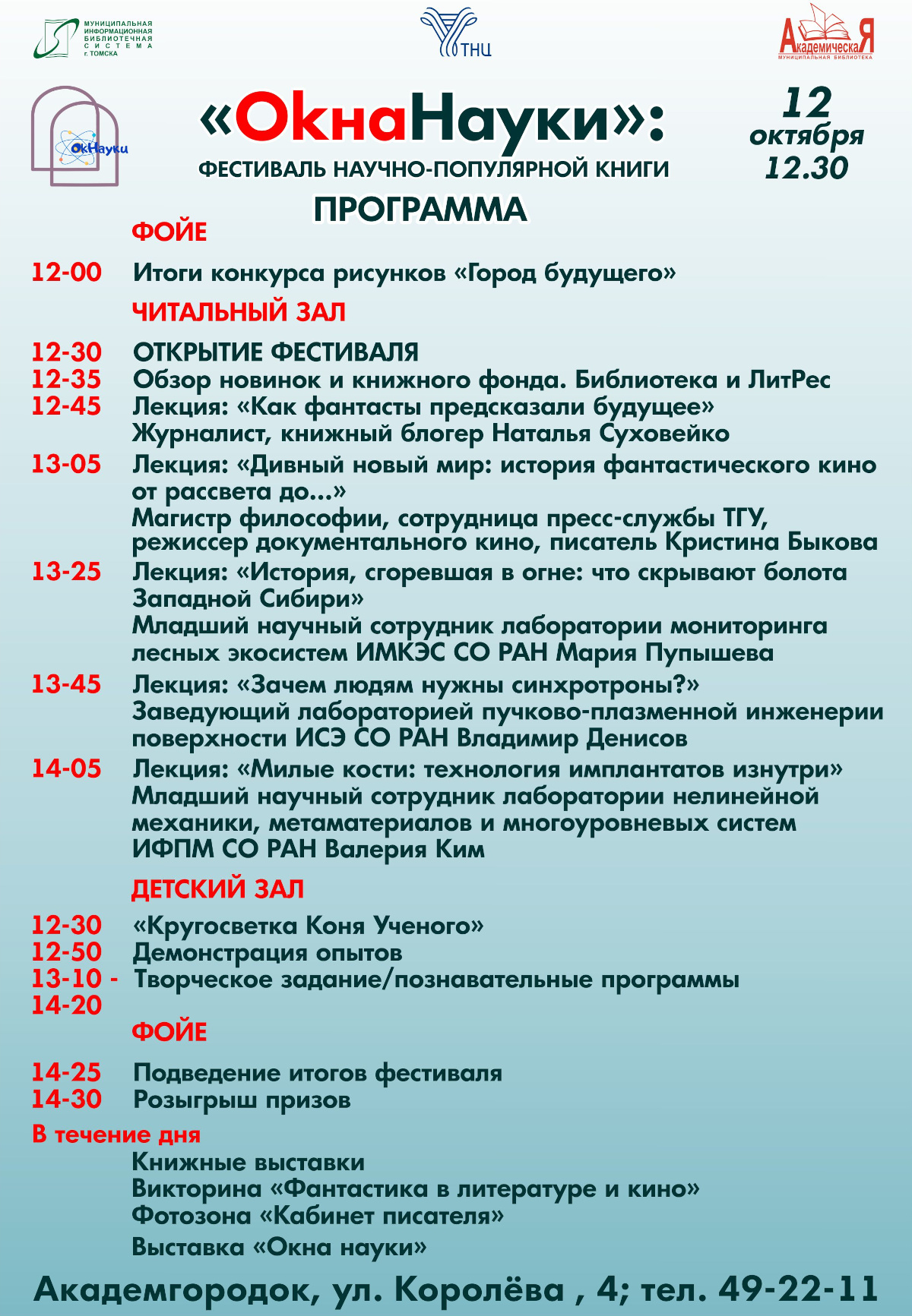 Третий Городской фестиваль научно-популярной книги «ОкнаНауки», организованный Муниципальной информационной библиотечной системой города Томска и Томским научным центром СО РАН, пройдет 12 октября в библиотеке «Академическая» по адресу ул. Королева, 4. В этом году темой фестиваля станет фантастика – на страницах книг и в стенах научных лабораторий. Начало в 12:30.