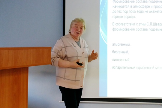 Затем Екатерина Матвеевна представила в своем докладе то многообразие тематик, которыми может заниматься специалист-гидрогеолог, в том числе одну из самых востребованных – изучение состояния питьевых вод Сибири и технологий их предварительной подготовки. Юные гости смогли узнать, что Томск – один из немногих городов, где центральное водоснабжение осуществляется из подземных источников.