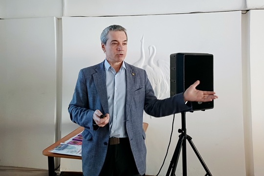 Со второй лекцией выступил доктор физико-математических наук, директор ИОА СО РАН чл.-кор. РАН, Игорь Пташник. Сначала он рассказал о вкладе первого академического института Томска в развитие космических исследований в сфере атмосферной оптики, лазерной физики, распространения излучения в атмосфере и атмосферной спектроскопии.